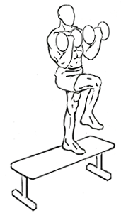 B. With weight on left foot, lift to standing on the step, right thigh raised so it’s parallel to floor; at the same time, curl weights up toward shoulders. Return to starting position. Do 15 reps, then switch sides and repeat. Do 3 sets.