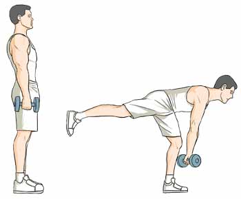 A. Stand holding optional weight in left hand. Hinge forward so back is flat and almost parallel to floor; rest right hand on a chair or low shelf for support. Extend left arm toward floor, palm facing in; lift straight left leg behind you, so body forms a T.