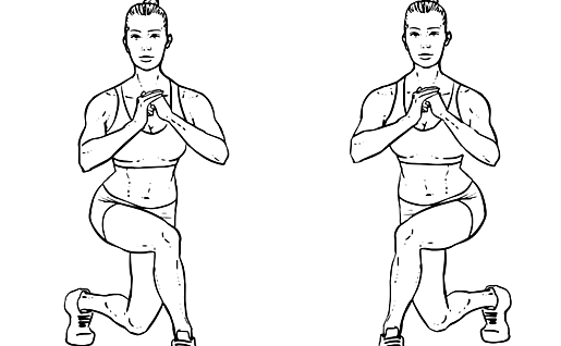 A. Stand with feet shoulder-width apart, elbows bent, optional weight at shoulder height, palms forward. Lower into a squat (don’t let knees go past toes); hold for a moment.